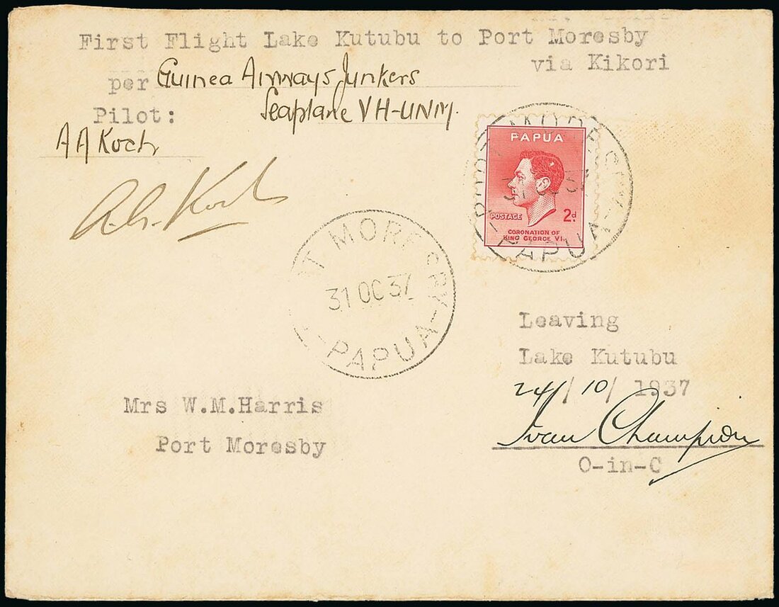 1937 (31 Oct.) envelope flown by Guinea Airways from Lake Kutubu to Port Moresby, franked at 2d., signed by pilot, Aubrey Koch and by Ivan Champion, the Officer in Charge of the Lake Kutubu Police Camp; some light overall discolouration. AAMC P121 - only 17 flown covers. Photo