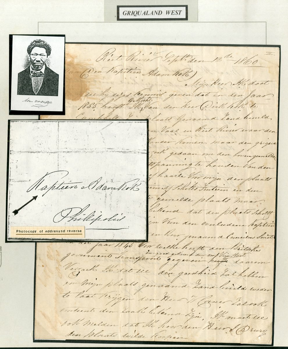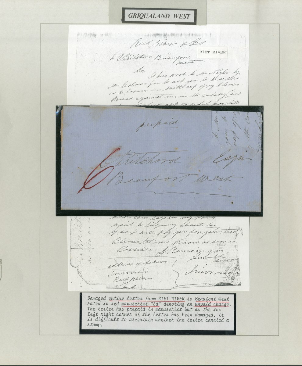 1860 (12 Dec.) entire letter, headed ”Piet River” from W. Davis to Kaptein Adam Kok at Phillipolis, requesting him to award him damages over property, no postal markings; also an entire letter from Riet River to Beaufort West with stamp torn off, marked ”prepaid” and showing manuscript ”6” in red, no other markings