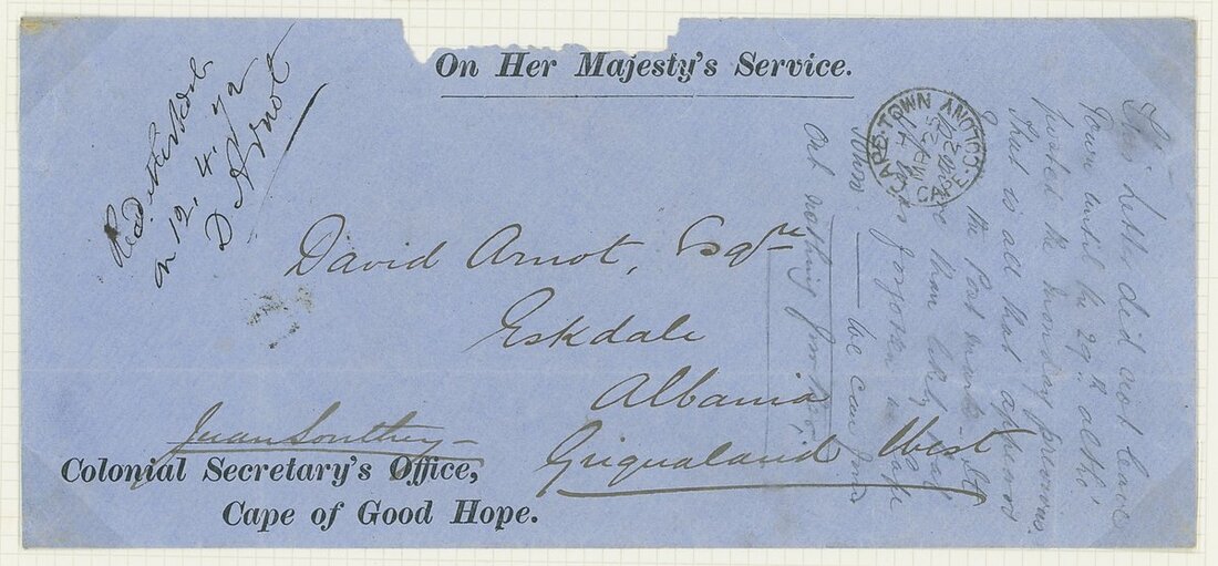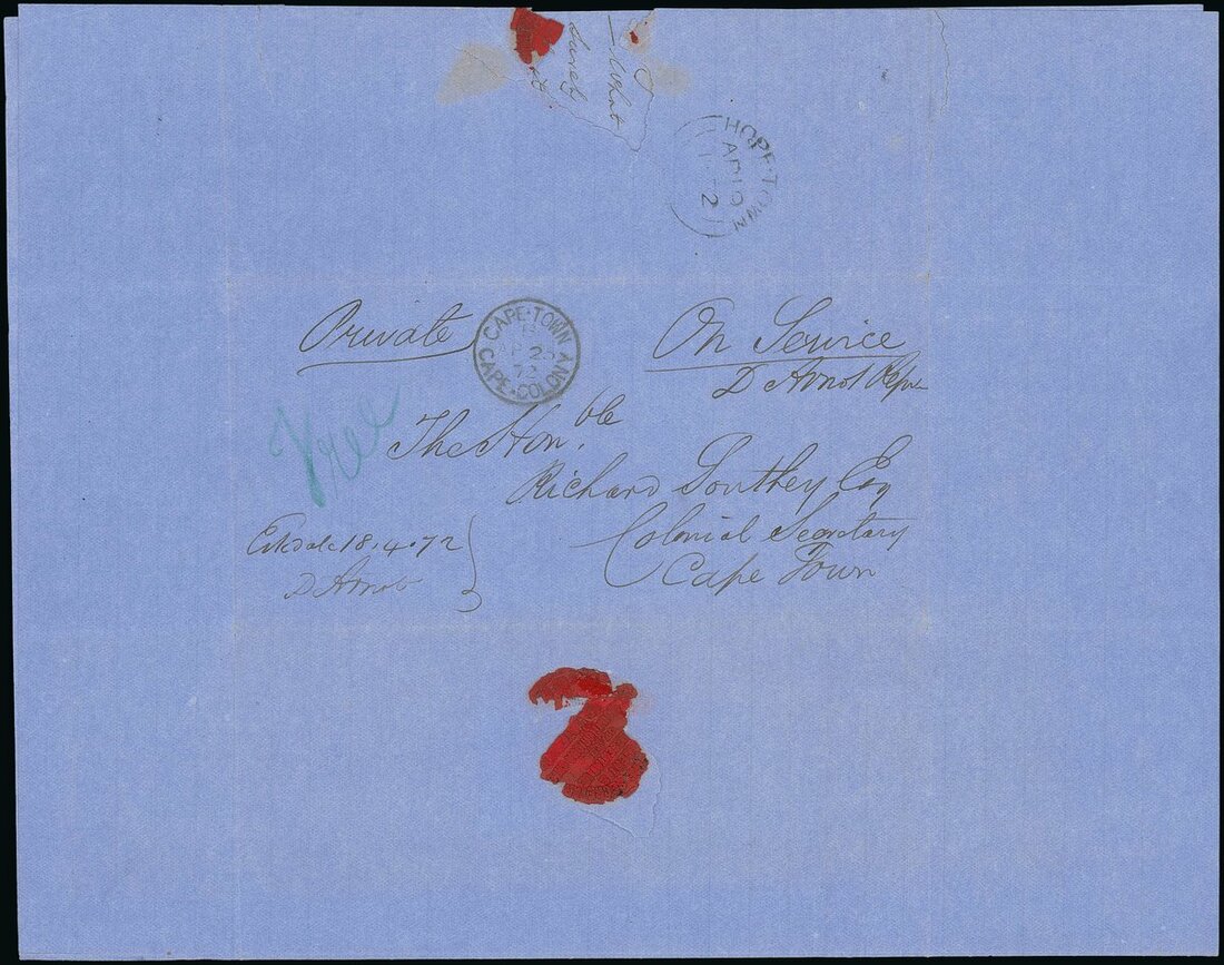 1872 (18 Apr.) entire letter headed ”Eskdale from D. Arnot, the agent and representative of the Griqua chief, Nicholas Waterboer, addressed to Richard Southey, the Colonial Secretary, Cape Town, marked ”On Service” and ”Free”, showing arrival c.d.s. (25.4) with Hopetown datestamp (19.4) on reverse along with a partial impression of Arnot’s red wax seal. The letter complains about the delay in receipt of Southey’s letter, and the original delayed envelope accompanies this, addressed to Arnot at his farm at Eskdale, Griqualand West. Arnot incorporates a copy of a letter received from the Cape Governor Sir Henry Barkly regarding future jurisdiction of the diamond fields and their annexation. An item of great significance in the postal history of Griqualand West; also 1872 letter from Griqua addressed to Mr. Southey describing the diggers on the north bank of the Vaal river. With transcript. Photo