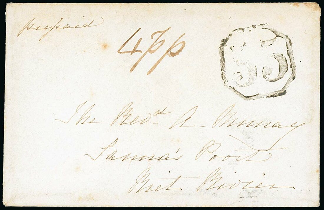 c.1850 small envelope ”Rev A. Murray, Sanna’s Poort, Riet River”, marked ”prepaid”, showing octagonal-framed “55” (Graaf-Reinett) with manuscript ”4pp”alongside. Photo