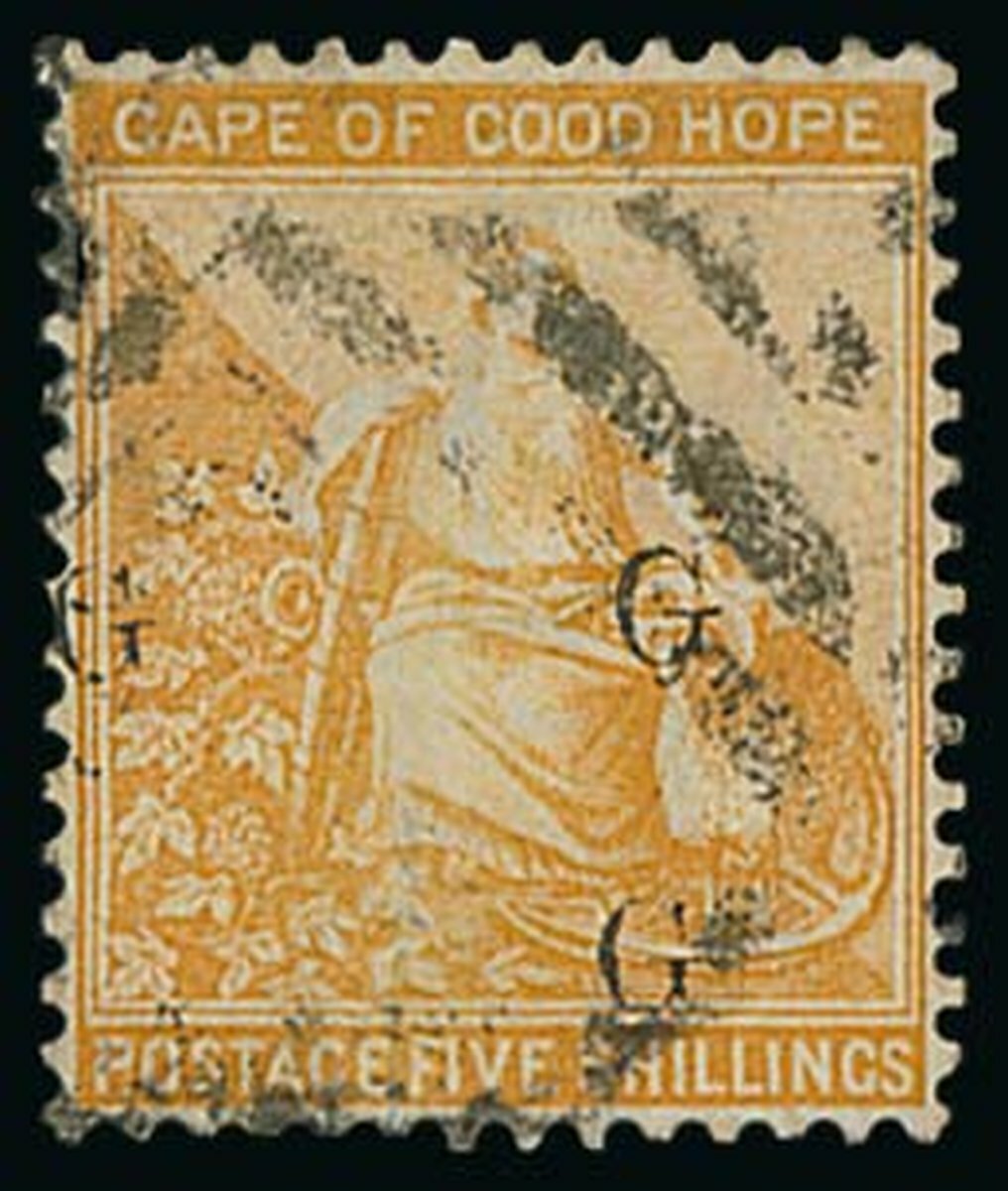 5/- yellow-orange, variety overprint triple, fine used. Very scarce. S.G. 29b, £500. Photo