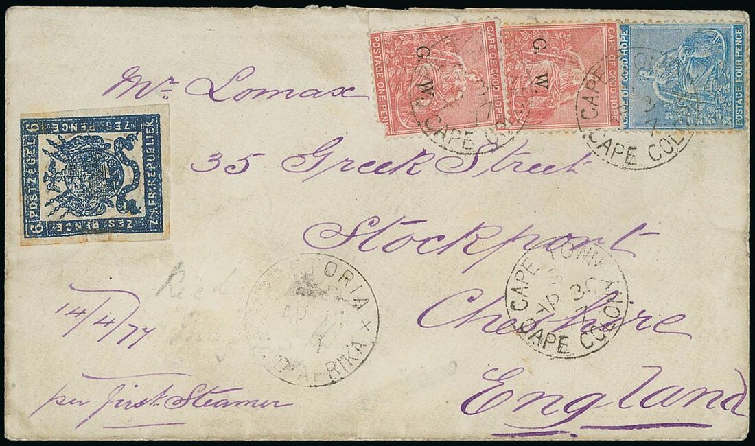 1877 (14 Apr.) envelope from Pretoria to England, bearing Transvaal 1875-77 imperf 6d. with very light central target obliterator and Pretoria c.d.s. alongside, in combination with Cape 4d. and Griqualand West 1d. (2) overprinted