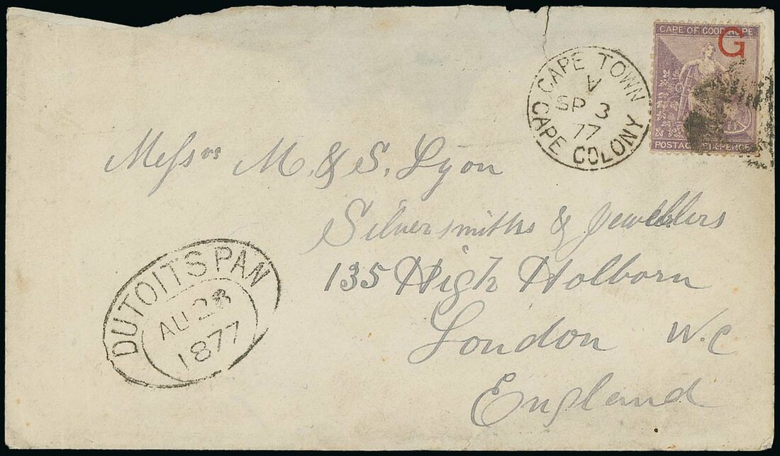 1877 (28 Aug.) envelope to London, bearing 6d. Type 6 tied by circle of bars, showing fine