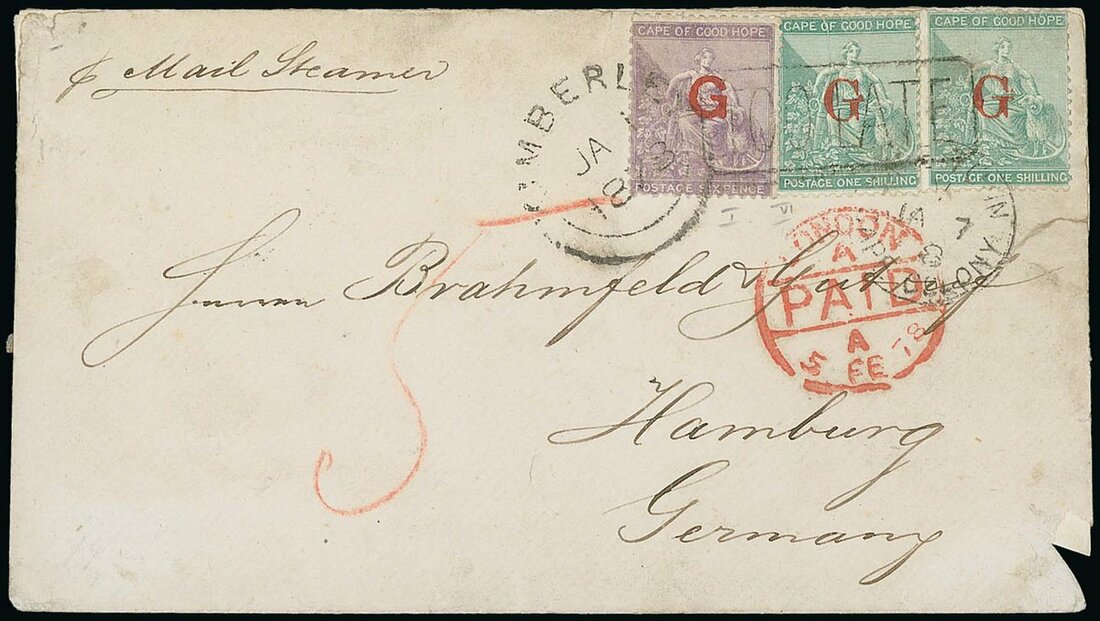 1878 (1 Jan.) envelope to Hamburg, bearing 6d. Type 6 and 1/- pair Type 1a, all crossed by framed