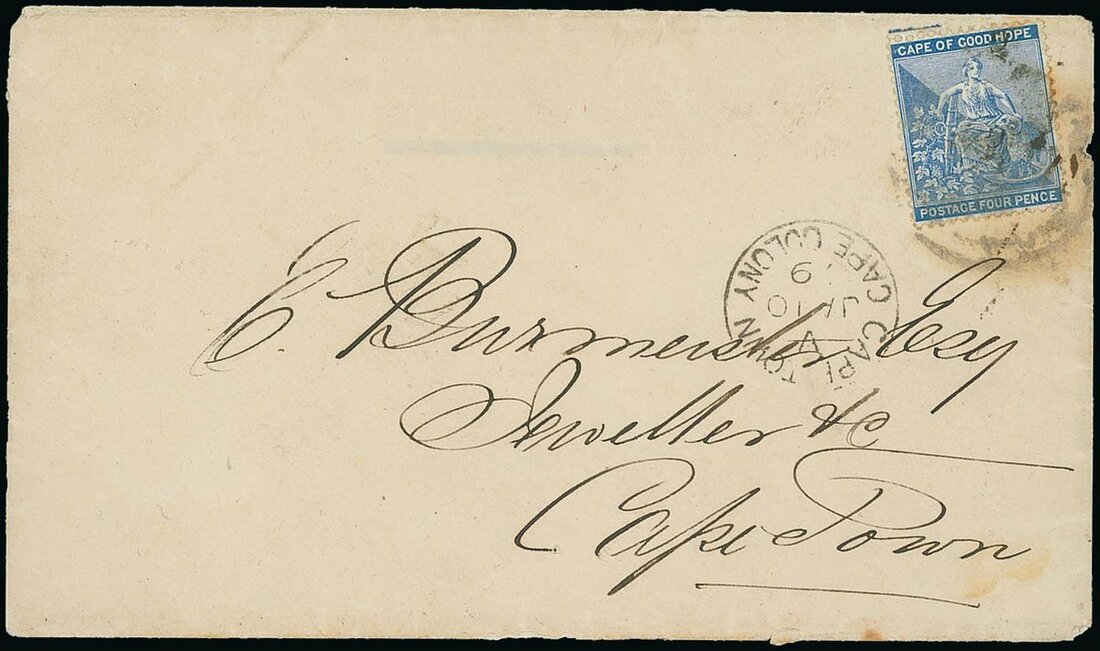 1879 (Jan.) envelope to Cape Town bearing 4d. Type 16 with variety overprint double, both inverted, tied by poor