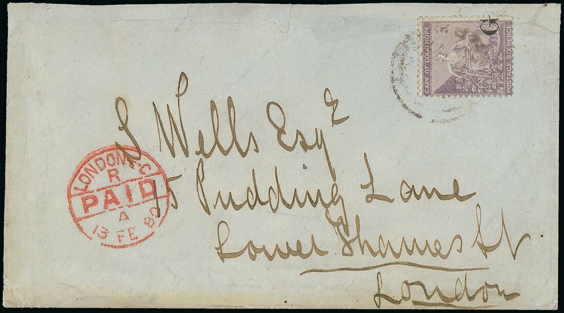 1880 (Jan.) envelope to London, bearing 6d. Type 7 tied by unclear double-arc d.s., showing red arrival Paid c.d.s. (13.2) and, on reverse, Cape Town transit datestamp (28.1). R.P.S. Certificate (1974). S.G. 13b. Photo