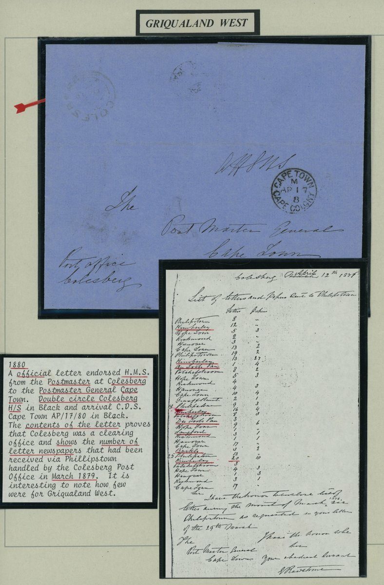 1880 entire letter from the Postmaster at Colesburg to the Postmaster-General at Cape Town, marked "OHMS" and showing arrival datestamp (17.4). The contents of the letter proves that Colesberg was a clearing office and shows the number of letter newspapers that had been received via Phillipstown handled by the Colesberg Post Office in March 1879. It is interesting to note how few were from Griqualand West.