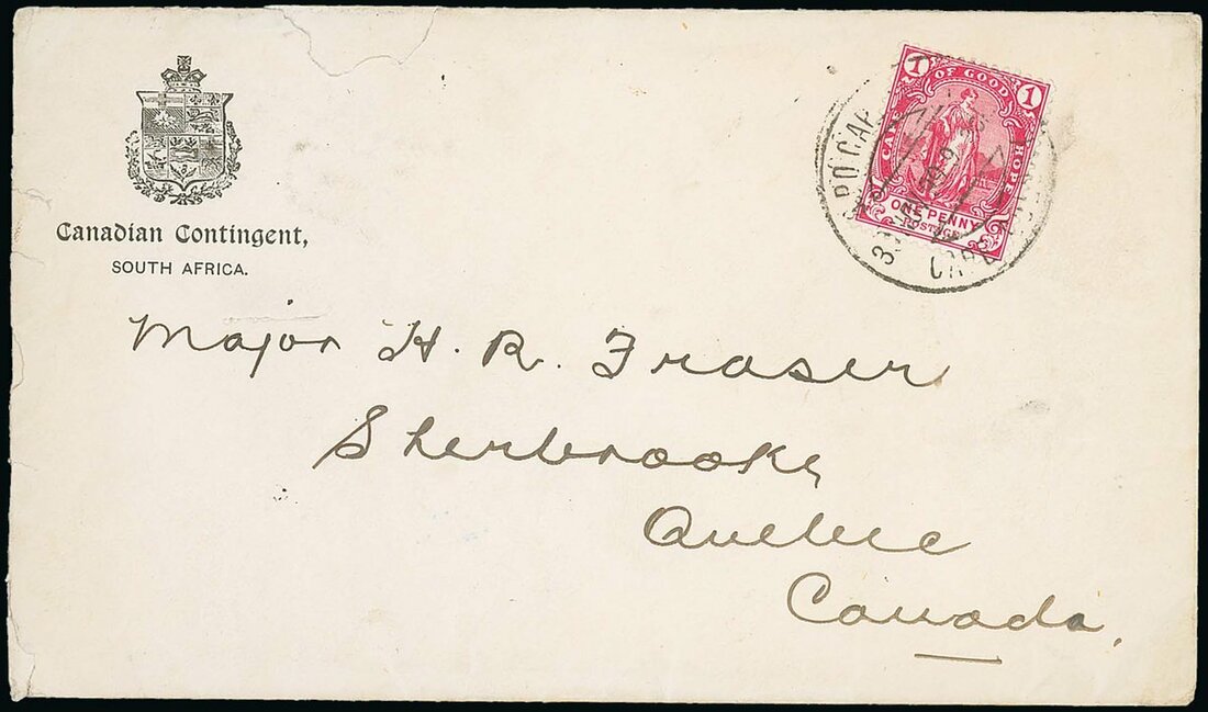 1899 (30 Nov.) special Canadian Contingent, South Africa envelope to Quebec bearing Cape 1d. red tied by Cape Town c.d.s., the reverse bearing a part strike of the arrival squared circle. A fine and rare cover, there were thought to have been only two recorded Contingent crest covers. Posted on the day of de-embarkation. Photo