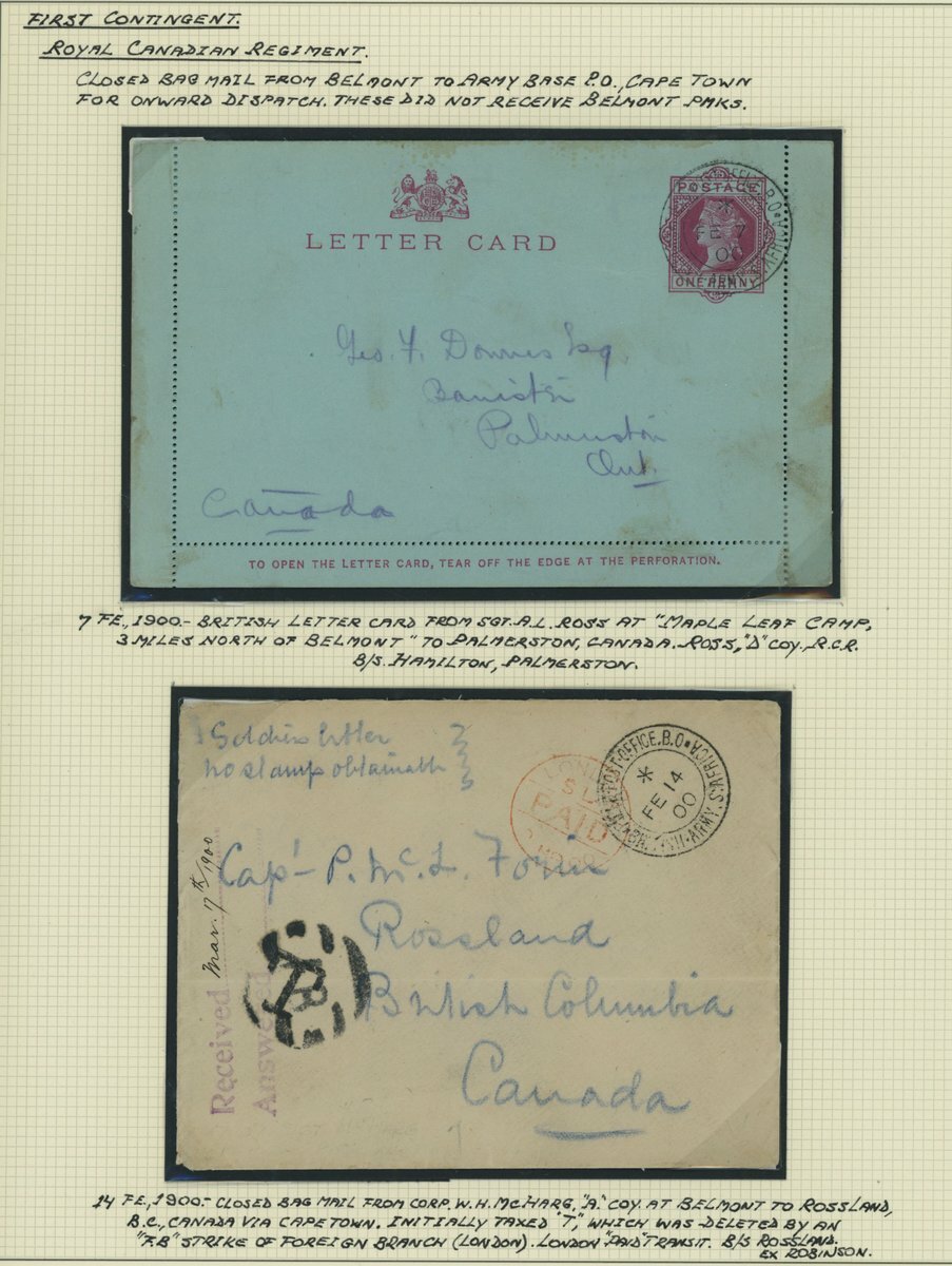 1900 (Feb.) two covers cancelled by Field Post Office B.O. c.d.s. with (7 Feb.) G.B. 1d. letter card (edges intact) to Ontario from "D" company at Maple Leaf Camp with interesting contents; (14 Feb.) stampless envelope marked "Soldiers Letter no stamps obtainable" to British Columbia from "A" company with large "T" overstruck by London "FB" cancellation and London Paid c.d.s. (2.3), the reverse with Rossland arrival c.d.s. (17.3), horizontal folding crease. Ex Robinson. (2 covers)