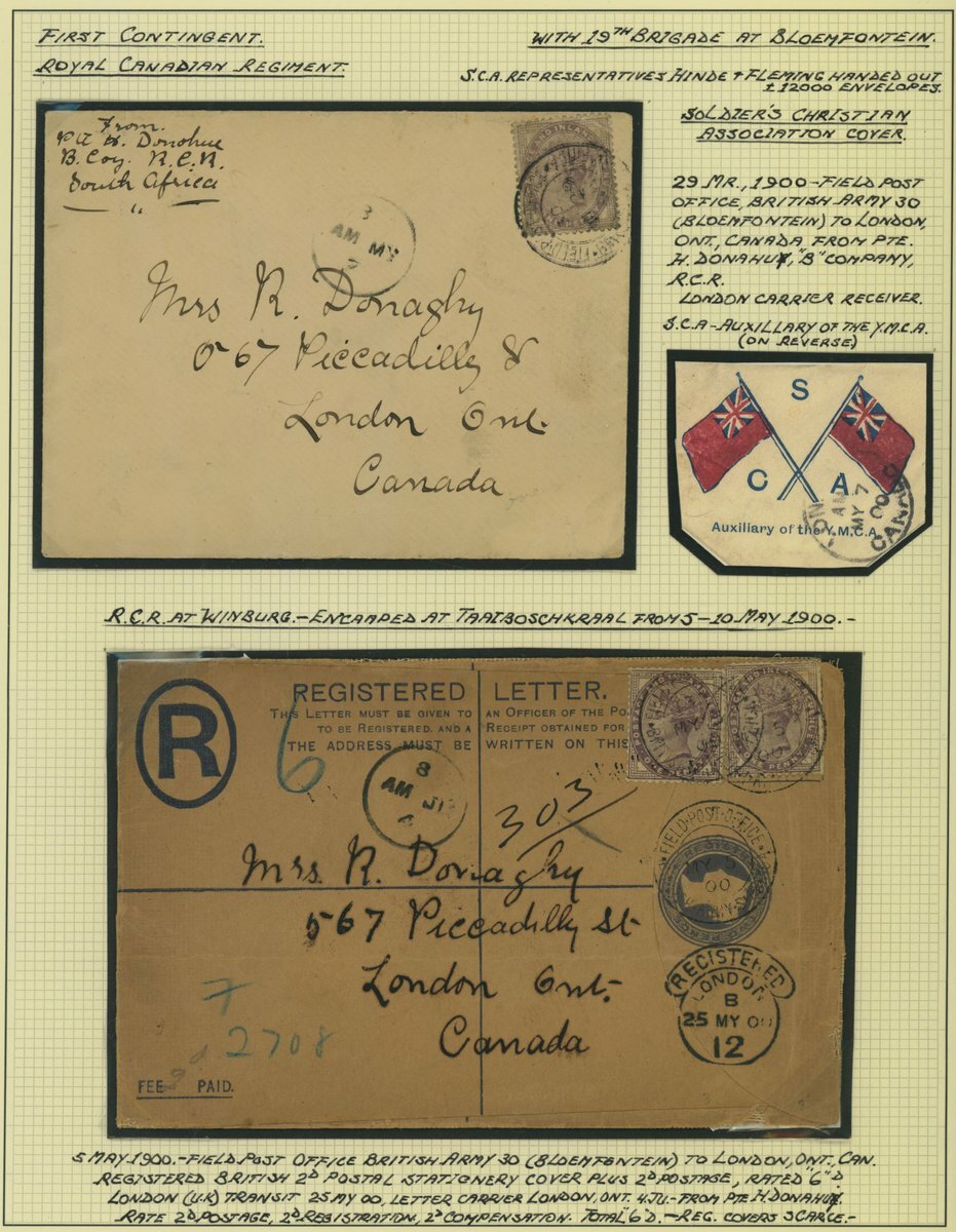 1900 (Mar. - May) two covers from the same correspondence to London, Ontario from H. Donaghy "B" company with (29 Mar.) S.C.A. envelope (Soldier's Christian Association) bearing G.B. 1d. lilac tied by Field Post Office B.O. c.d.s., transit c.d.s. alongside with the arrival c.d.s. (7.5) on the reverse; (5 May) G.B. 2d. registered envelope (size G) uprated G.B. 1d. lilac (2) cancelled by Field Post Office B.O. c.d.s., hooded London registered c.d.s. (25.5) and transit c.d.s., the arrival c.d.s. on reverse (2.6), light ageing but a scarce registered envelope. (2 covers)