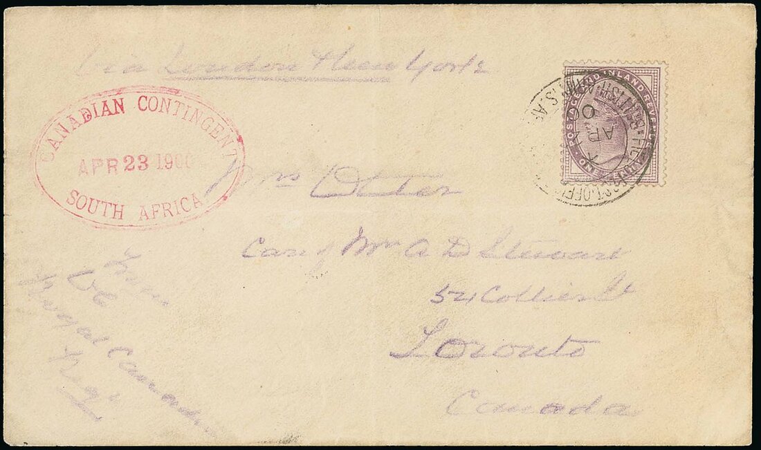 1900 (23 Apr.) envelope from Lt. Col. Otter to his wife in Toronto "Via London & New York" bearing G.B. 1d. lilac tied by Field Post Office B.O. c.d.s. with a light strike of the Canadian Contingent dated oval in red, the reverse bearing a light strike of Toronto c.d.s. (12.5); horizontal crease and some paper ageing. An important cover from the officer in command of the First Contingent. Photo