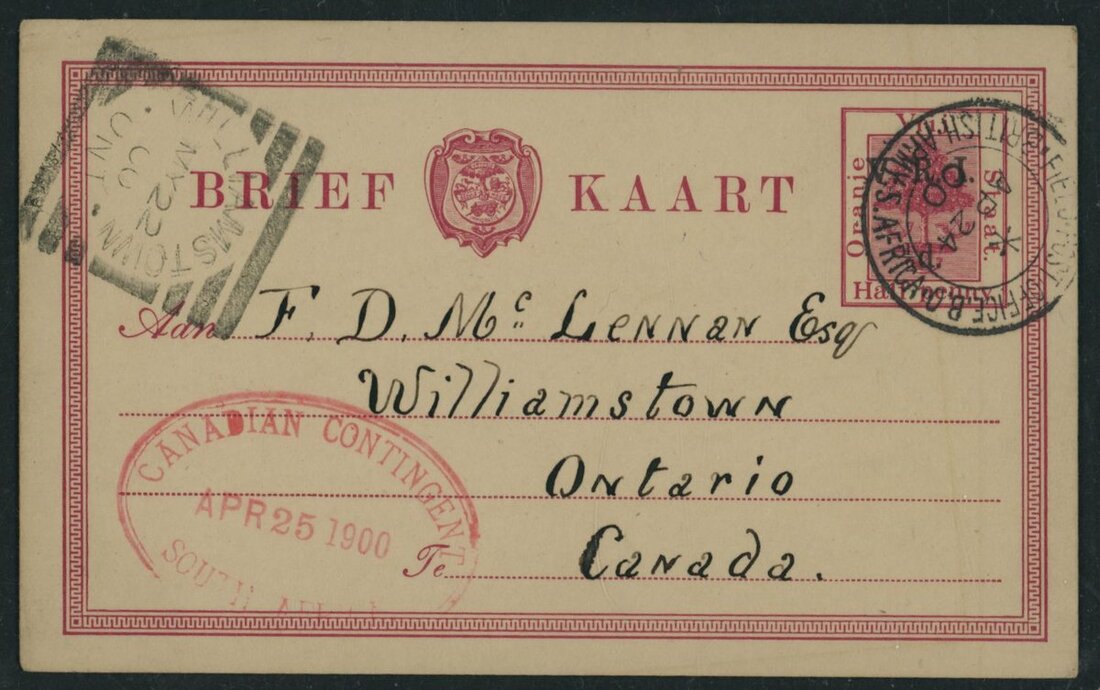 1900 (24 Apr.) Orange Free State V.R.I. ½d. stationery card to from Bloemfontein to Ontario cancelled by Field Post Office B.O. c.d.s. with Canadian Contingent dated oval in red (25.4) and Williamstown squared circle arrival datestamp (22.5). Fresh and fine