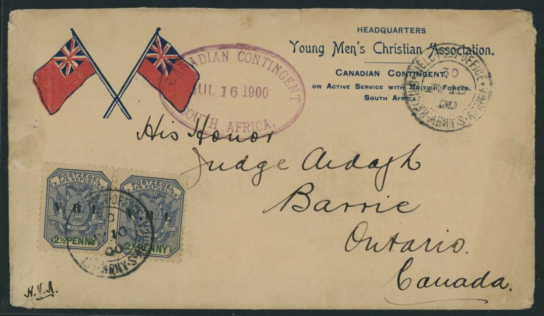 1900 (10 July) Y.M.C.A. Headquarters patriotic envelope (Rowe type E) to Ontario bearing pair to Transvaal V.R.I. 2½d. pair tied by Field Post Office/30 c.d.s. with a second strike at top and a good strike of the Canadian Contingent dated oval (16.7) type 3 in purple, the reverse bearing Barrie arrival c.d.s. (13.8); good to fine. On guard duty at the railway at Springs