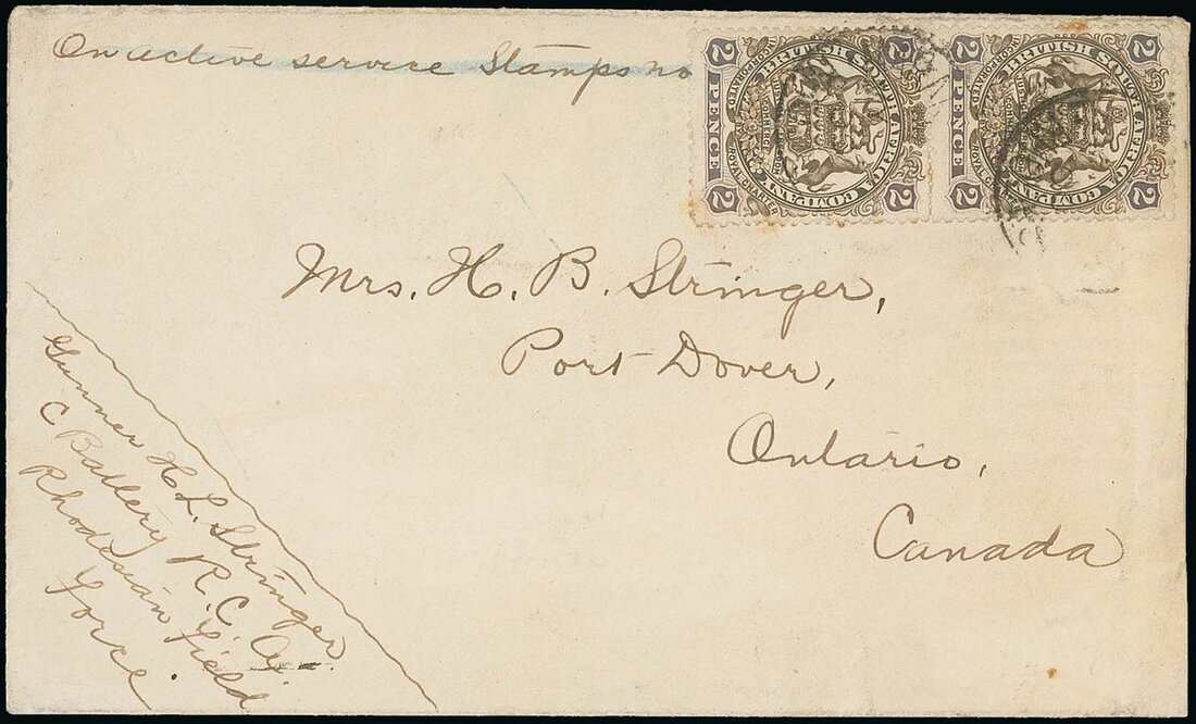 1900 (3 May) envelope to Ontario from "Gunner H.L. Stringer, C Battery R.C.A., Rhodesian Field Force", no stamps available has been crossed through and a pair of Rhodesia 1897 2d. tied by Marandella's c.d.s. (without date slug), the reverse with Umtali (4.5) and Port Dover arrival c.d.s. (19.6). A rare and highly important cover, thought to be one of only three recorded from Rhodesia. Photo