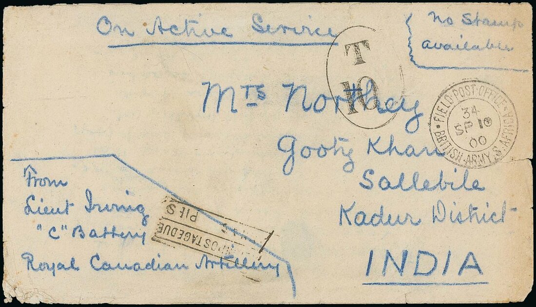 1900 (10 Sept.) stampless "On Active Service" envelope from Lt. Irving to India bearing a very fine strike of Field Post Office/34 c.d.s. (Kroonstad) with Durban "T/10" in oval and Indian Postage Due handstamp for 1a.; the reverse bearing Durban transit (24.9), Sallebile arrival (30.10) and a fine strike of the diminutive Chikmagapul Unpaid dated oval in green; some edge faults. Very rare mail to India from this campaign. Photo
