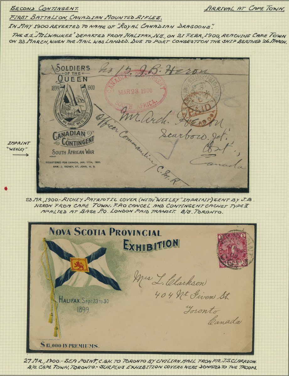 1900 (23 Mar.) opened-out stampless patriotic envelope posted en route, the mail was taken ashore before disembarkation and this bears a fine strike of Canadian Contingent type II dated oval in red (23.3), with Field Post Office B.O. c.d.s. (23.3) and London Paid c.d.s. (16.4), countersigned by the commanding officer; the reverse bearing Toronto arrival c.d.s. (8.3). The envelope is a Richey 'Soldiers of the Queen' with Wesley imprint. A good cover taken ashore before the 'Milwaukee' docked. Also (27 Mar.) illustrated Nova Scotia Provincial Exhibition envelope to Toronto bearing Cape 1d. tied by Sea Point c.d.s., the reverse with Cape Town and Toronto c.d.s. (surplus envelopes were donated to the troops). (2 covers)