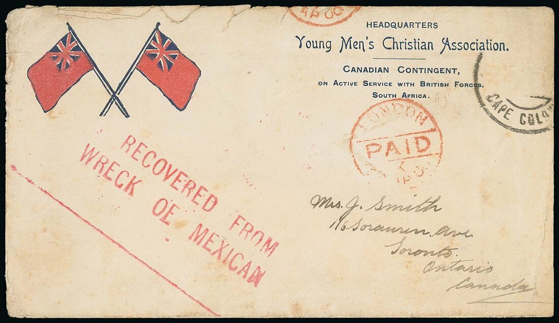 1900 (Mar.) Y.M.C.A. patriotic cover (Rowe type E) to Toronto, cancelled by Cape Colony c.d.s. (the adhesive washed off) with a fine strike of "