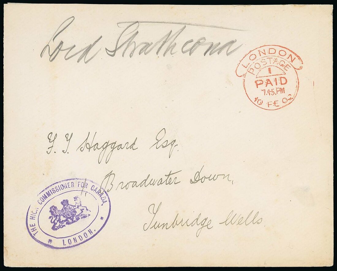 Official Cachet: 1902 (10 Feb.) stampless official envelope to Tunbridge Wells, bearing a fine strike of the oval handstamp of the High Commission for Canada, London struck in purple, with hooded London Postage Paid c.d.s. in red and signed in pencil "Lord Strathcona", the reverse with embossed Canadian High Commission and Tunbridge Wells c.d.s. (10.2). A good introductory cover. Photo
