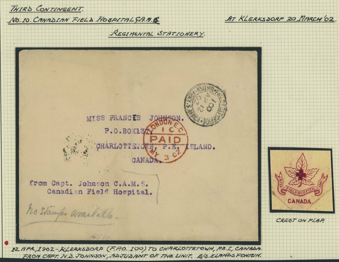 1900 (12 Apr.) stampless envelope from Capt. Johnson to Prince Edward Island marked "No stamps available" bearing Field Post Office/100 (Klerksdorp) c.d.s. and London Paid transit c.d.s. (3.5), the flap bearing the crest of No.10 Field Hospital AMC printed in red and Army Post Office Elandsfontein (13.4). Rare regimental stationery