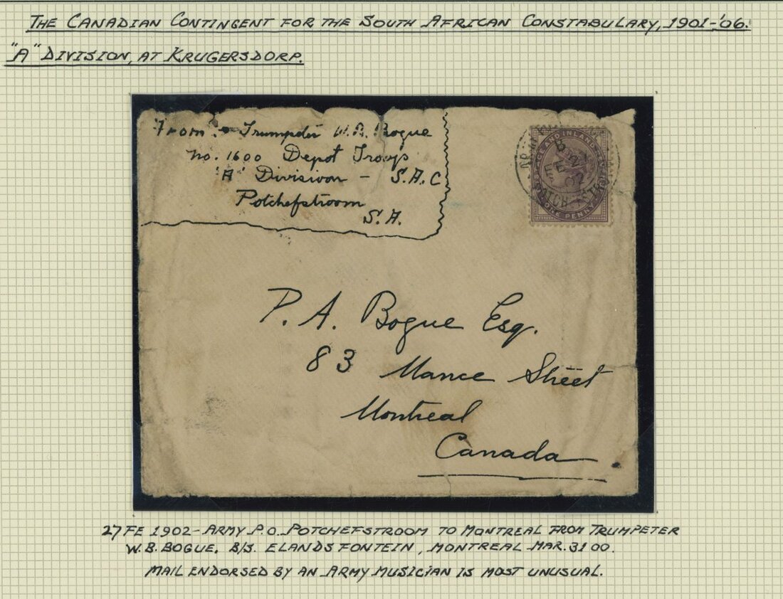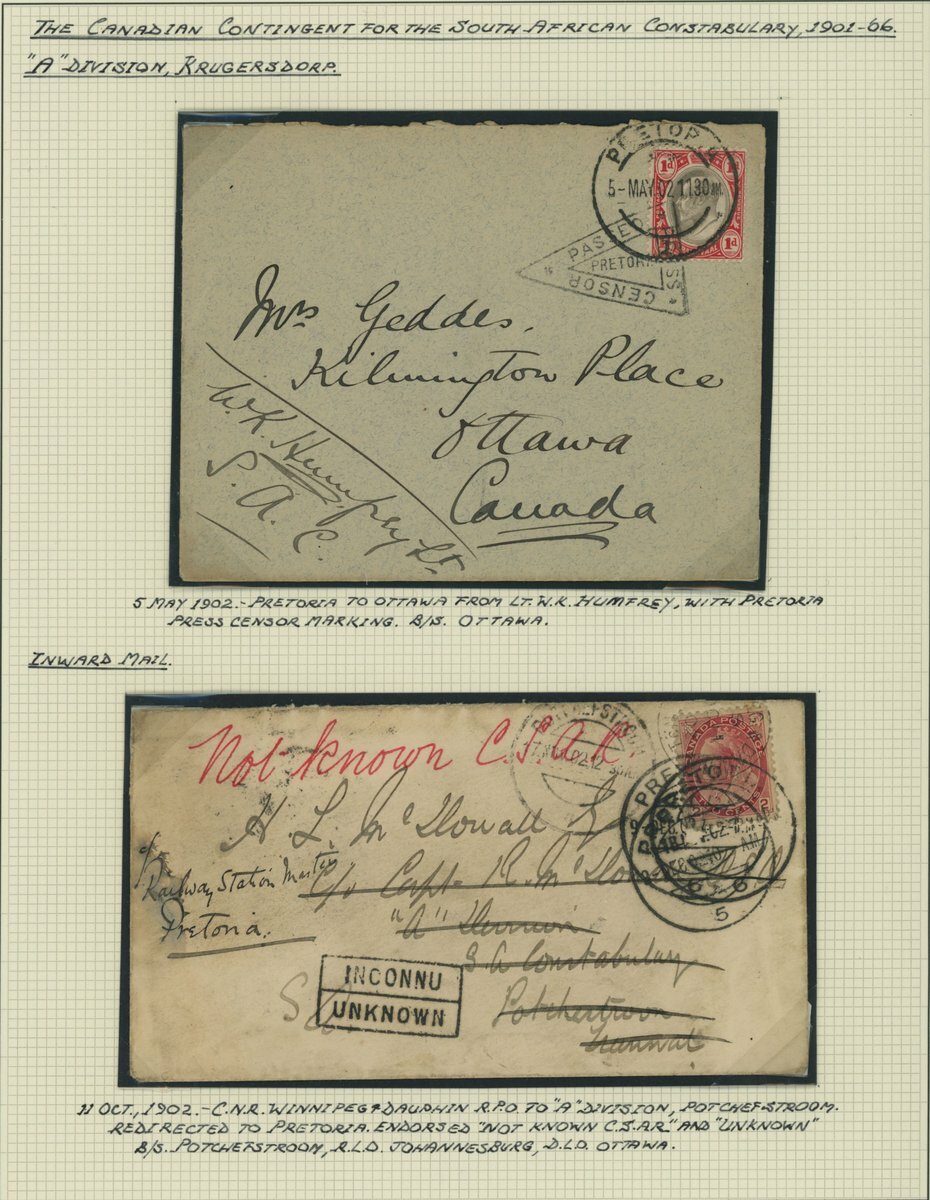 1902 a group of covers with (9 Jan.) G.B. 2d. registered envelope uprated 1d. lilac to Vancouver, cancelled by Army Post Office Potchefstroom from Capt. C.C. Bennett, district commandant; (3 Mar.) envelope to Montreal bearing G.B. 1d. lilac tied by Potchefstroom c.d.s. with local oval censor datestamp and faint Johannesburg censor handstamp, from trooper Barbor; (27 Feb.) envelope to Montreal (soiled) bearing 1d. lilac tied by Army Post Office Potchefstroom and sent from "Trumpeter W.B. Bouge, Depot Troops, 'A' Division...", unusual mail from a musician; (5 May) envelope to Ottawa bearing Transvaal K.E.VII 1d. tied by Pretoria c.d.s. with triangular Press Censor handstamp; (11 Oct.) incoming envelope from Winnipeg & Dauphin R.P.O. to Potchefstroom with manuscript "Not known C.S.A.R." and boxed "