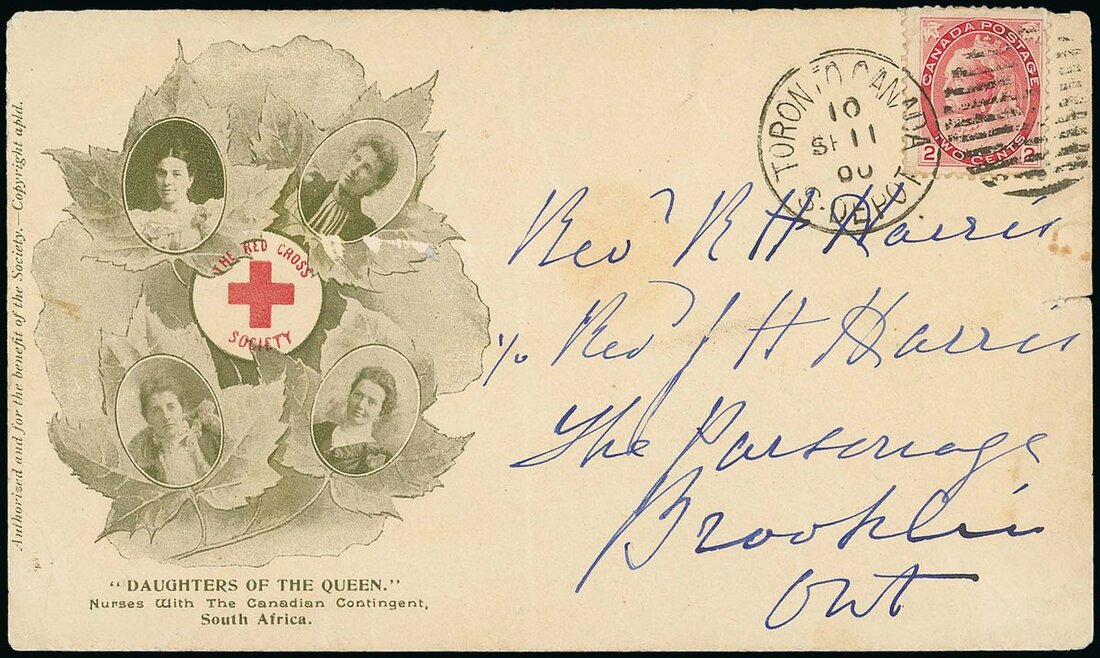 Daughters of the Queen: 1900 (11 Sept.) envelope printed in green and red to Brooklin bearing 2c. carmine tied by Toronto duplex; some creasing; also 1900 (5 Apr.) purple and red envelope to Washington bearing 2c. carmine tied by Broadview Avenue, Toronto; small tear top left corner and slightly reduced at right. Scarce. Rowe 54-13. Ex Richardson. Photo