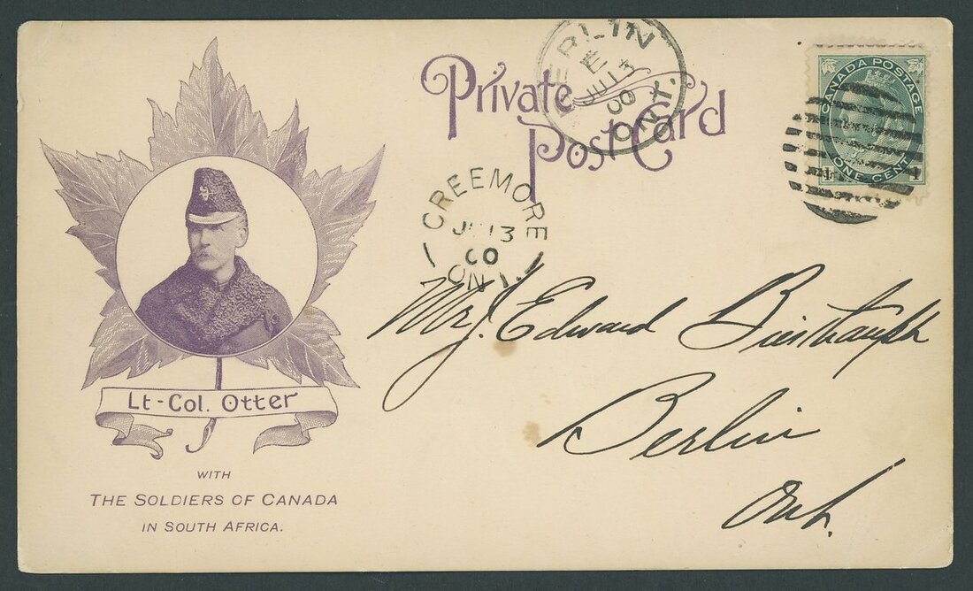Soldiers of Canada: Lt.- Col. Otter; 1900 (13 June) card to Berlin bearing 1c. blue-green tied by Greemore postmarks with the arrival c.d.s. alongside. Fine