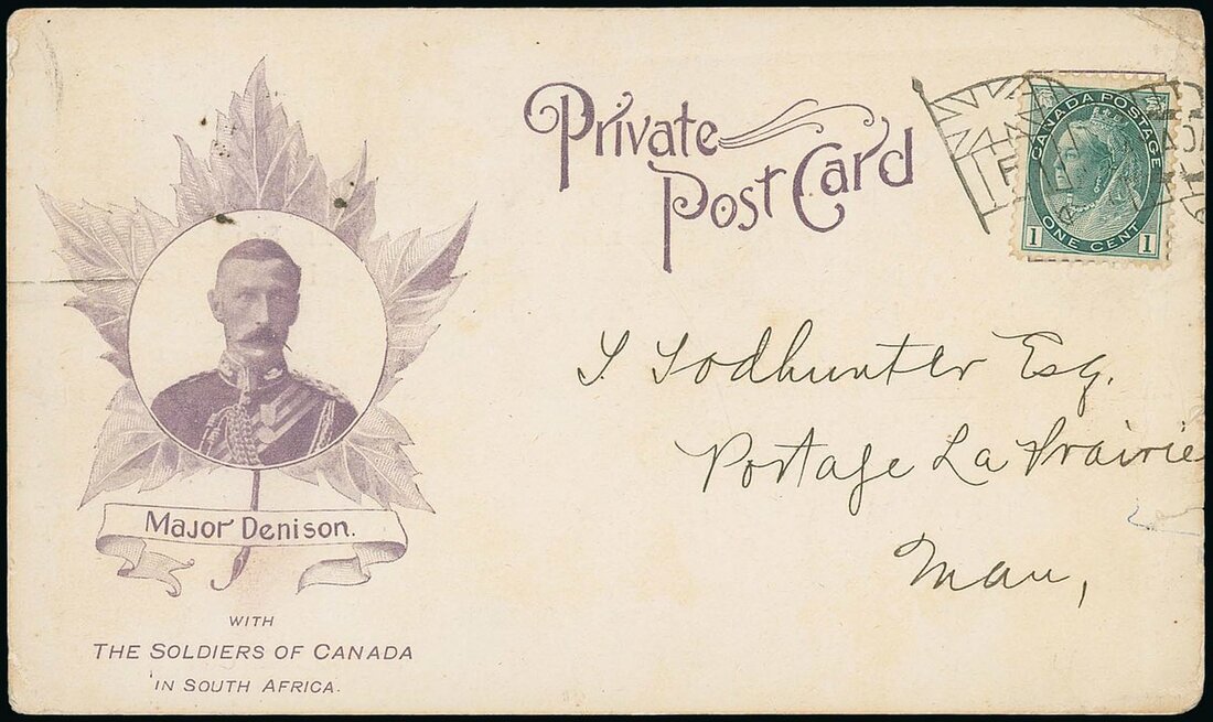 Soldiers of Canada: Major Denison; 1900 (30 May) purple on buff stock to Portage La Prairie bearing part Toronto Flag cancellation; a few minor marks. With advertisement for W.G. Gage & Co. on reverse. Photo