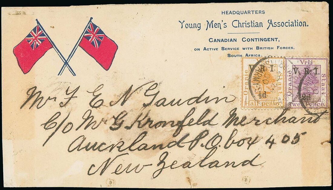 1900 (24 Apr.) type E envelope to Auckland, New Zealand bearing O.F.S. V.R.I. ½d. and 2d. tied by Field P.O. c.d.s.; the reverse bearing Cape 1d. (defective) tied by Field Post Office B.O., Lyttleton and Auckland c.d.s. (8.6); sent by Tpr. Thomas J. Gaudin, N.Z. Mounted Rifles, First Contingent on S.S. 'Wainera'; a little soiled. Photo