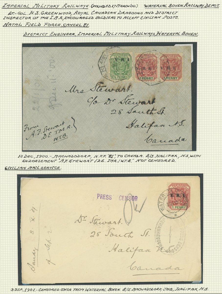 Waterval Boven: 1900 (13 Dec.) envelope to Halifax "From A.F. Stewart. DE. IMR. W.T.B." (District Engineer, Imperial Military Railways, Waterval Boven) bearing Transvaal V.R.I. ½d. and 1d. (2) tied by octagonal Natal Field Force datestamps; also 1901 (3 Sept.) another envelope from the same correspondence bearing Transvaal E.R.I. 1d. tied by Waterval Boven c.d.s. with straight-line "