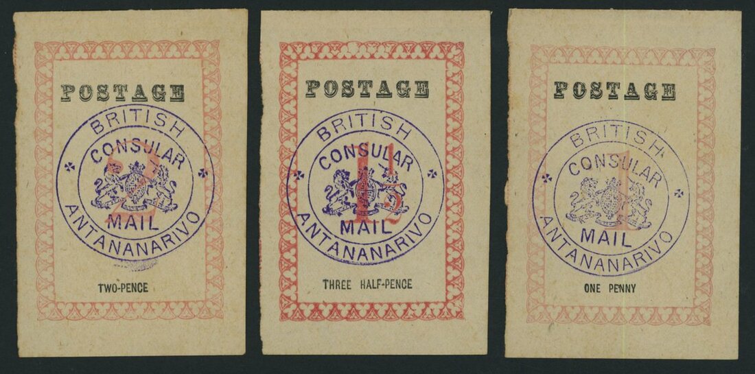 1d. rose, 1½d. rose and 2d. rose, all with violet handstamp and all unused, the 1½d. with original gum at top left corner, fine. S.G. 33b, 34b, 35b, £805