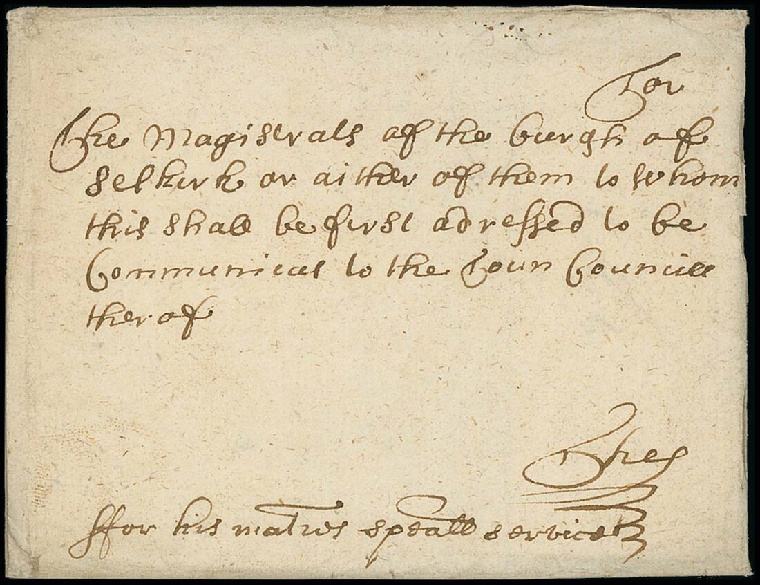 1688 (13 Sept.), entire letter with contents, from Edinburgh, addressed to "The magistrats of the Burgh of Sekirk or aither of them to whom this shall be first addressed to be communicat to the Town Council therof" and "... ffor his maties speall service", with superb and largely intact red wax seal "