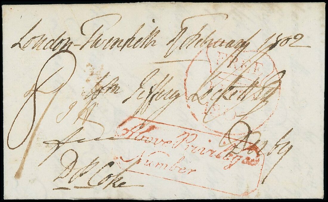 1802 (20 Feb.) entire letter from London to Derby with red "Apple" Free marking and red boxed "Above Privileged/Numbe", rated "7" (deleted) and "8"; dated marking on reverse; Interesting contents including "..The intended course of the new turnpike road which I think will be advantageous to the Town & County of Derby". Fine and the Above Privileged marking (with the final "d") previously unrecorded