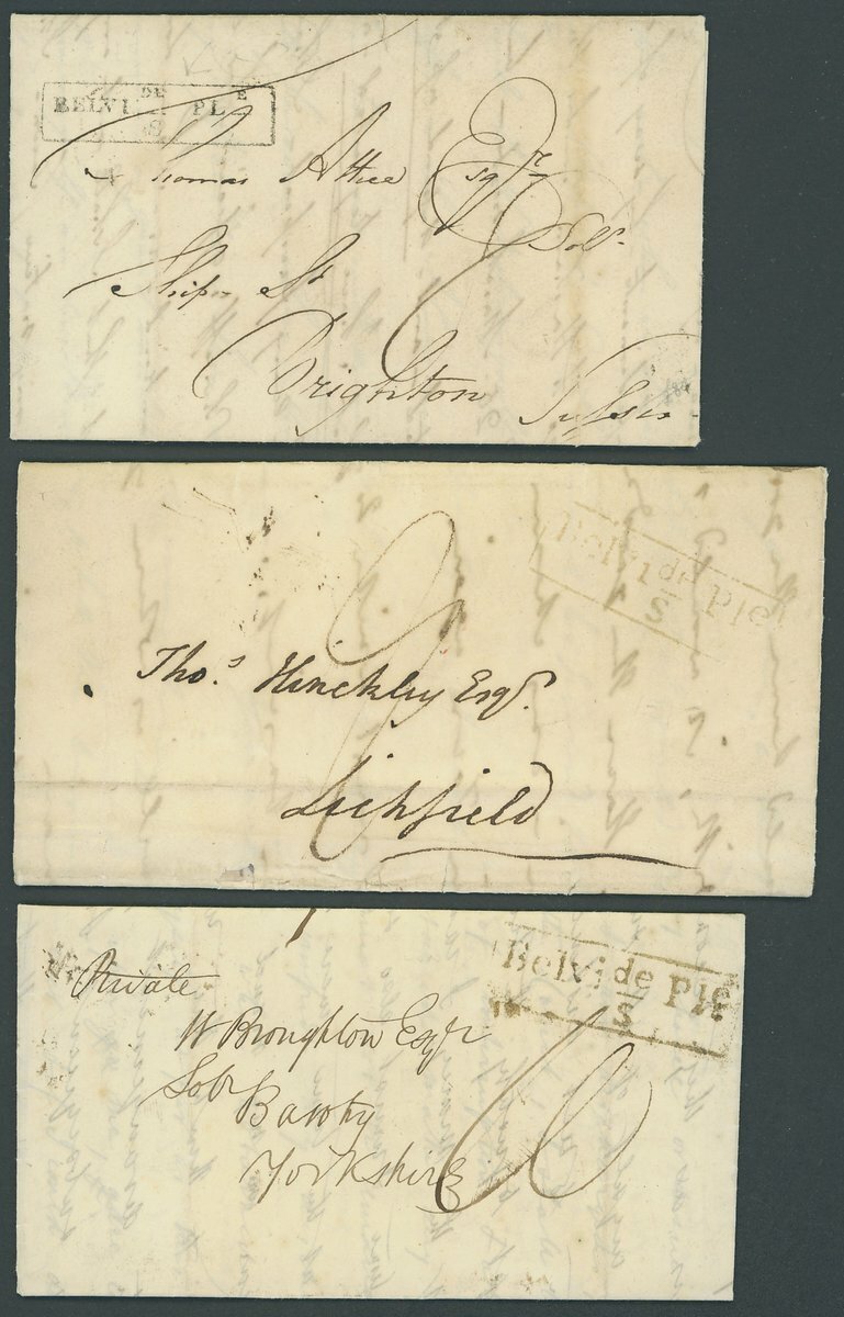 1821-34, entire letters to Brighton, Lichfield and Yorkshire, each with framed "