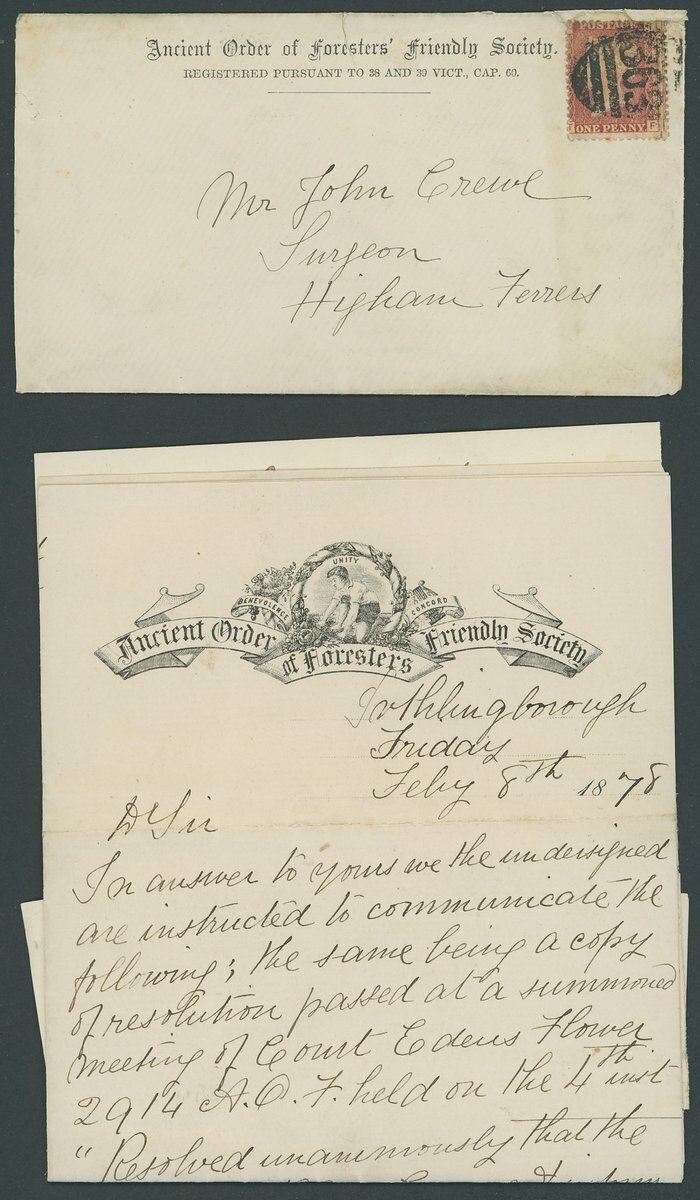 1878 (9 Feb.), printed "Ancient Order of Foresters' Friendly Society" envelope to Higham Ferrers, franked 1d. with "363" barred oval cancellation, included are two letters displaying the Society engraved heading and another letter from the chief Ranger; some small faults but rare and attractive