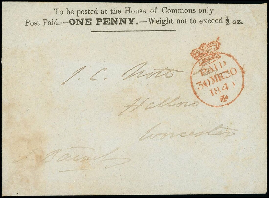 1d. black House of Commons envelope printed on greyish wove paper without watermark, used to Towcester, cancelled on face by crowned circle "