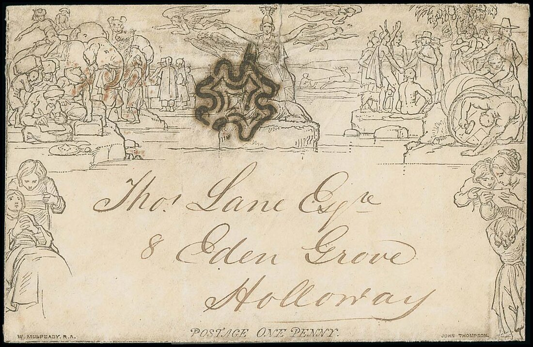 A131, dated 1 Sept. 1840, addressed to Holloway, central black Maltese Cross cancellation, on reverse red datestamp and "T.P./Chief Office; small cover imperfections but a rare Mulready used on the second day of the experimental use of the black Cross