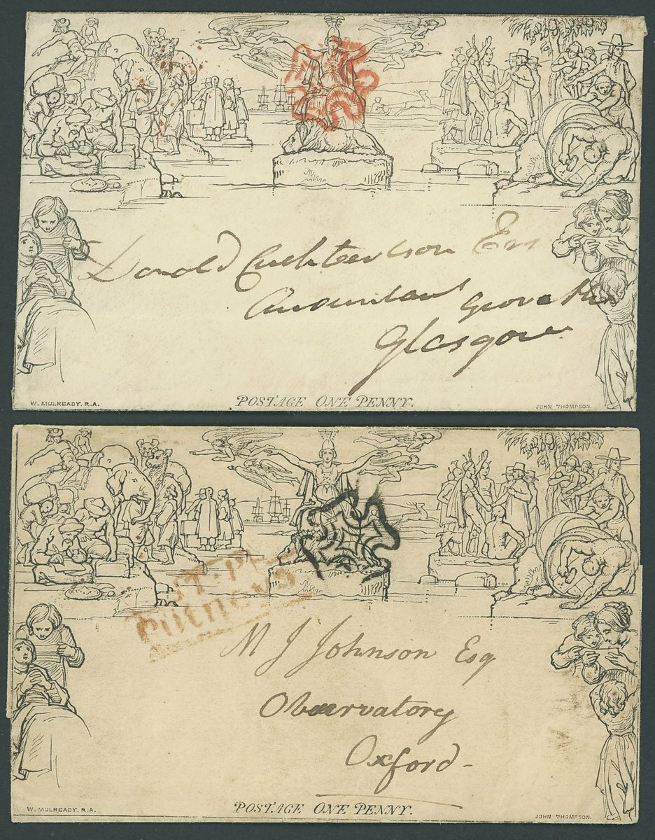 A139, dated 9 Nov. 1840, central red Maltese Cross cancellation, used from Edinburgh to Glasgow and with dated markings of 9-10 Nov. 1840 on the reverse. Also 1d. Letter sheet, stereo obscured, dated 22-23 Oct. 1841, black Maltese Cross cancellation with red step type T.P/Putney alongside and dated markings on the reverse; good to fine