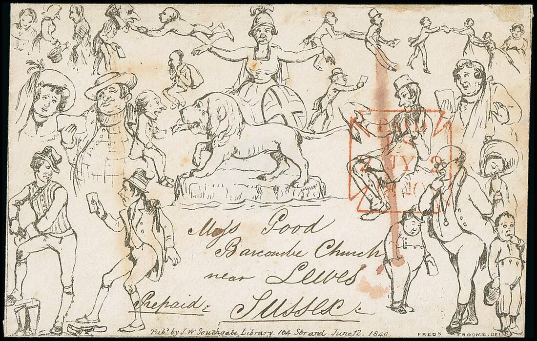 J.W. Southgate No. 5 'Mr. Pickwick' illustrating characters giving and receiving letters; 1840 (2 July) envelope from London to Lewes with London "