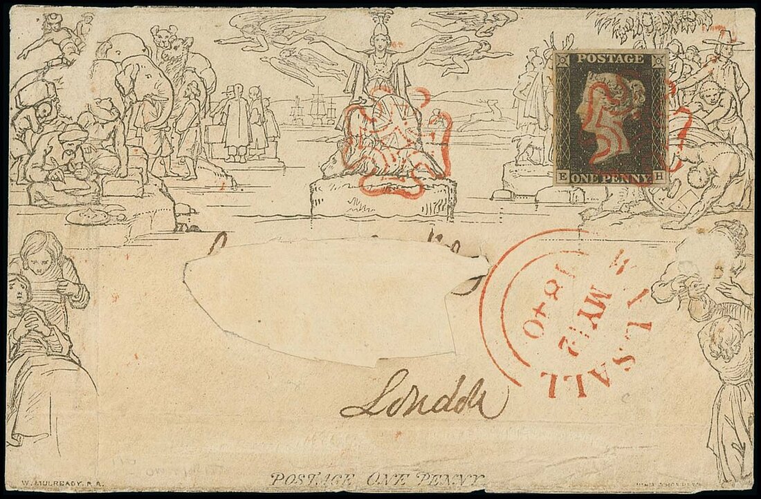 EH, good to large margins all round, tied by a crisp red Maltese Cross to front of Mulready 1d. envelope with central red Maltese Cross, address panel cut out but with a clear red Walsall c.d.s. of 12 May 1840 alongside
