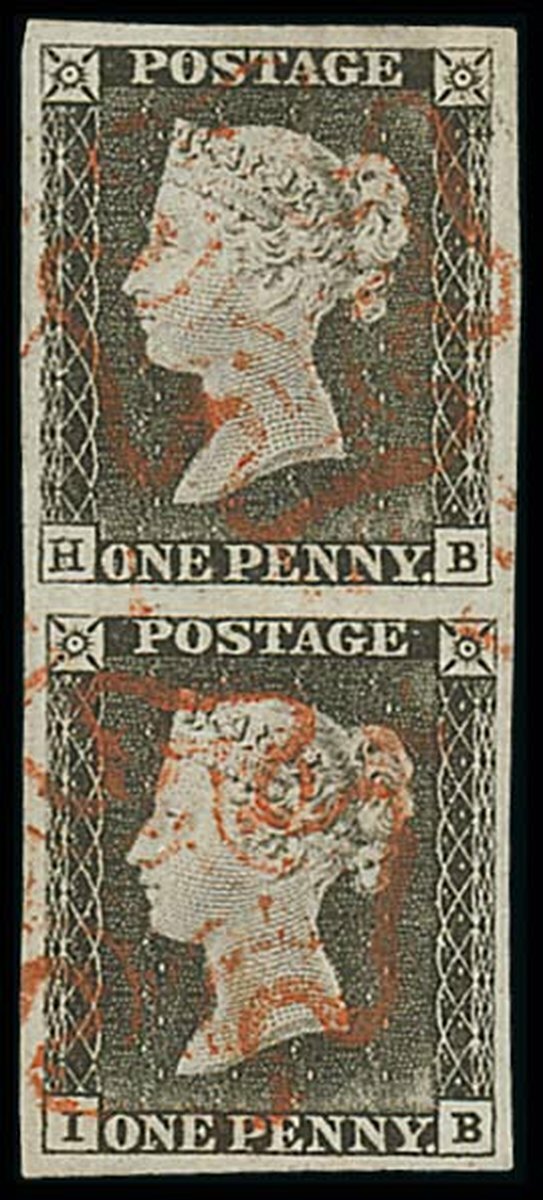HB-IB vertical pair with strong plate wear, lightly cancelled by red Maltese Crosses. Fine and rare.