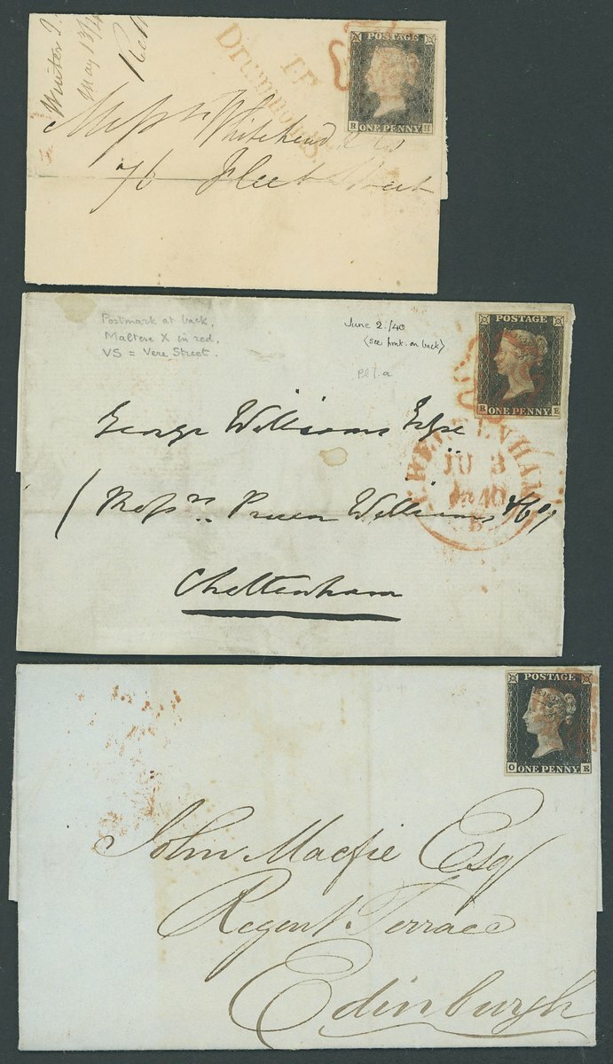 OE, touched at right, on entire letter from Liverpool to Edinburgh dated 19 Oct. 1840, RE, cut into ar right on front to Cheltenham dated 3 June 1840, RH, margins all round, possibly cleaned and re-used on small entire to Fleet St. dated inside recd. May 13/40; some faults