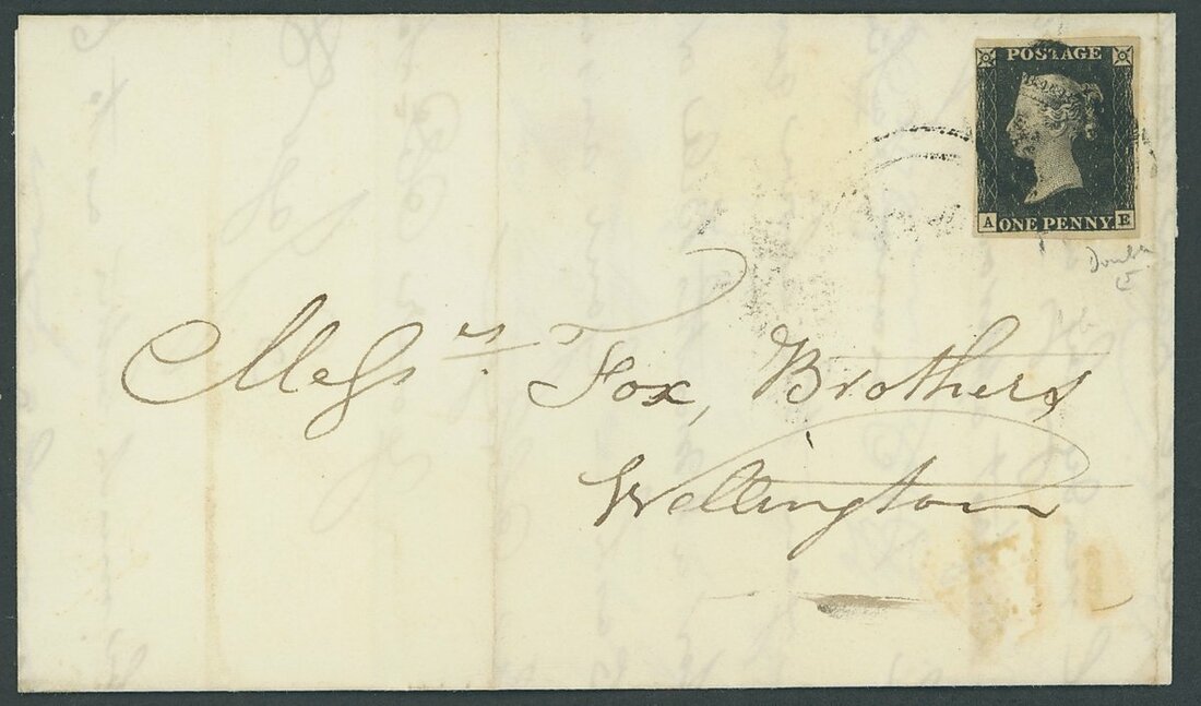 AE, double letter E, just touched at left, good margins other sides, tied to Fox Bros entire letter from Bodmin to Wellington by a large part unclear double ring datestamp only, c.d.s. of 24 Sept. 1840 across flap on reverse; vertical filing fold clear of the adhesive, fine