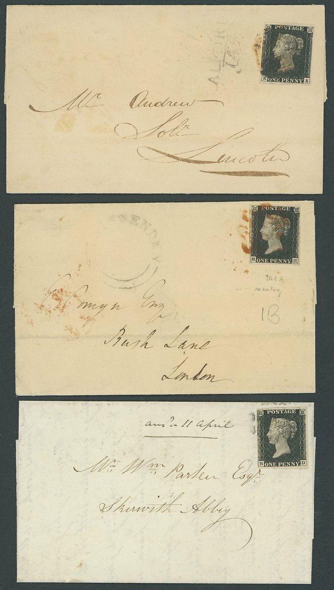 KA, large margins, tied by red Maltese Cross to entire to Lincoln with Alford/146 Mileage alongside; MH, retouched check letters, close to good margins all round on entire to London with Missenden u.d.c. alongside; ND, retouched check letters, close to large margins, tied by black Maltese Cross to entire letter from Warwick-on-Eden to Penrith dated 2 April 1842 (later use of this Plate); a few minor imperfections but a good group (3 covers)