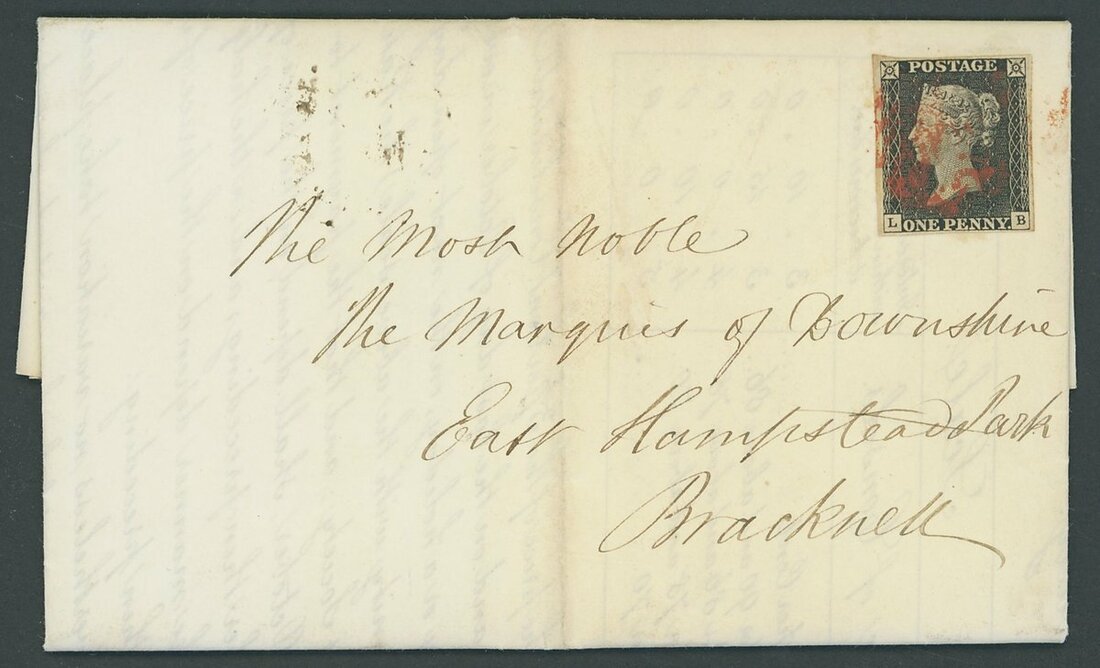 LB, recut side lines. small to large margins, cancelled by a light strike of a bright red Maltese Cross on entire letter (printed Insurance Company's minutes) to the Marquis of Downshire in Bracknell, dated marking of 4 Jan. 1841 on the reverse; light vertical filing fold well clear of the adhesive, fine