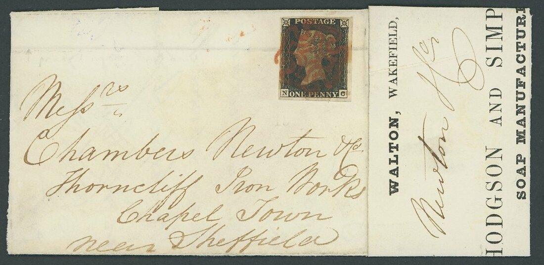 NC, retouched check letters, small to large margins all round, tied by a red Maltese Cross in a deep shade to entire letter with printed Soap manufactures heading, addressed to Sheffield, Wakefield c.d.s. of 23 Jan. 1841 on the reverse; horizontal filing fold crosses the adhesive and the entire with tears repaired by hinges