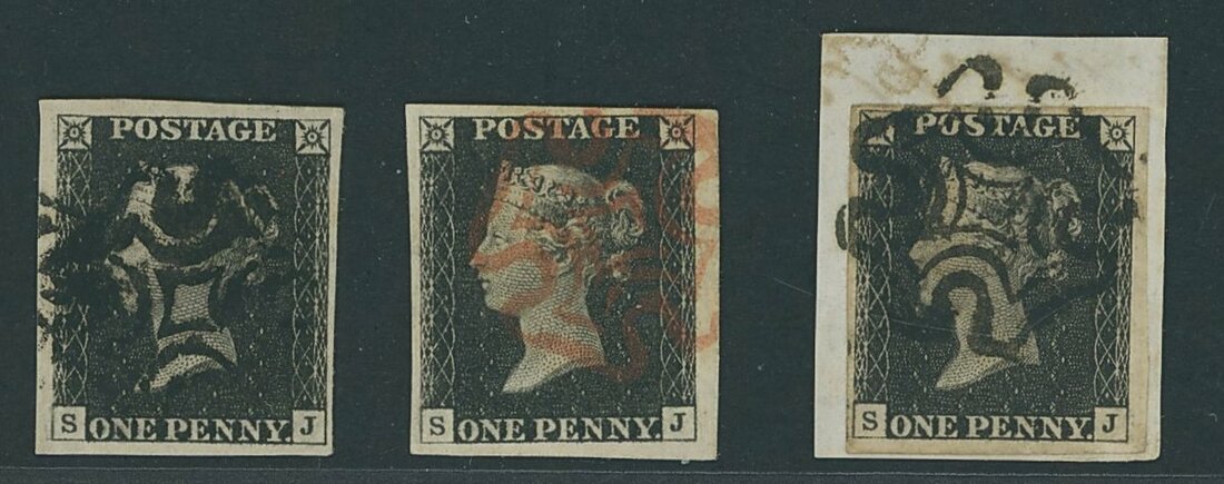SJ (3), two cancelled by black Maltese Cross, one on piece, and one cancelled by red Maltese Cross; all good to very large margins and a fine trio.