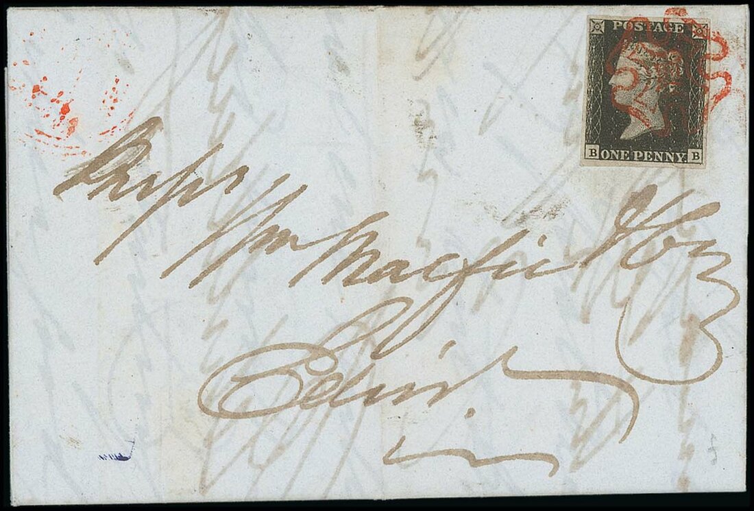 BB, good to large margins, tied by a very fine strike in red of the Greenock distinctive Maltese Cross cancellation to entire letter to Edinburgh with dated markings of Oct. 9 and 10 1840 on the reverse; clean vertical filing fold well clear of the adhesive, fine