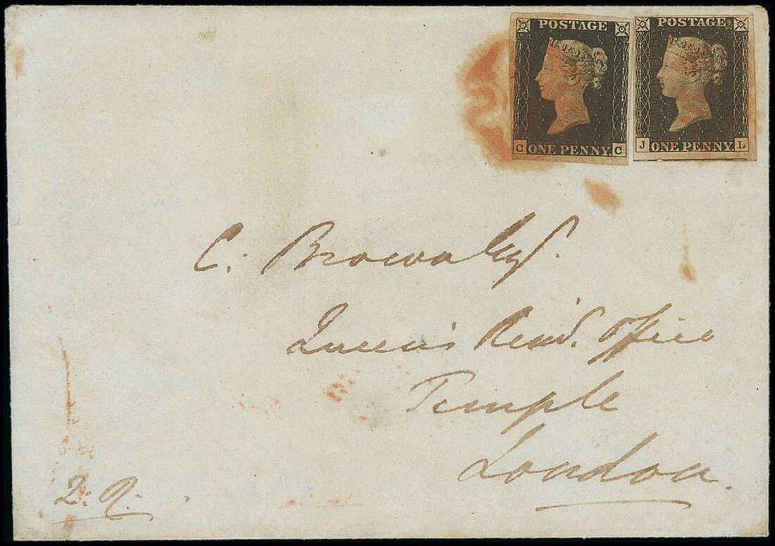 CC and JL (JL without ray flaw), each with good to very large margins, JL showing a portion of the adjoining stamp at foot, tied by oily red Maltese Cross cancellations to envelope to London with Arrirngton u.d.c. and red London c.d.s. of 17 May 1840 on the reverse; a trifle soiled. Rare. B.P.A. Certificate (2005)