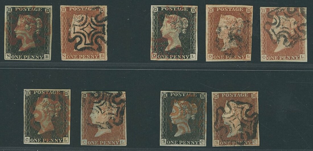 Four matched pairs: CL, NB, OL and SC. All the blacks cancelled by red Maltese Crosses, the reds cancelled by black Maltese Crosses. All with four margins with exception of 1d. red NB. Fine and scarce.
