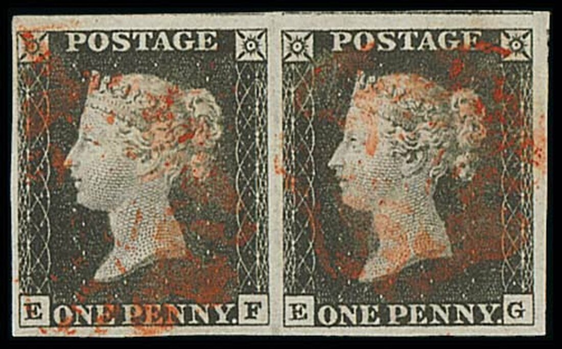 EF-EG horizontal pair, good to very large margins across the top showing portions of the adjoining pair, cancelled by red Maltese Crosses in slightly watery ink; tiny corner bend at upper left mentioned only for the sake of accuracy, otherwise a fine and scarce pair.